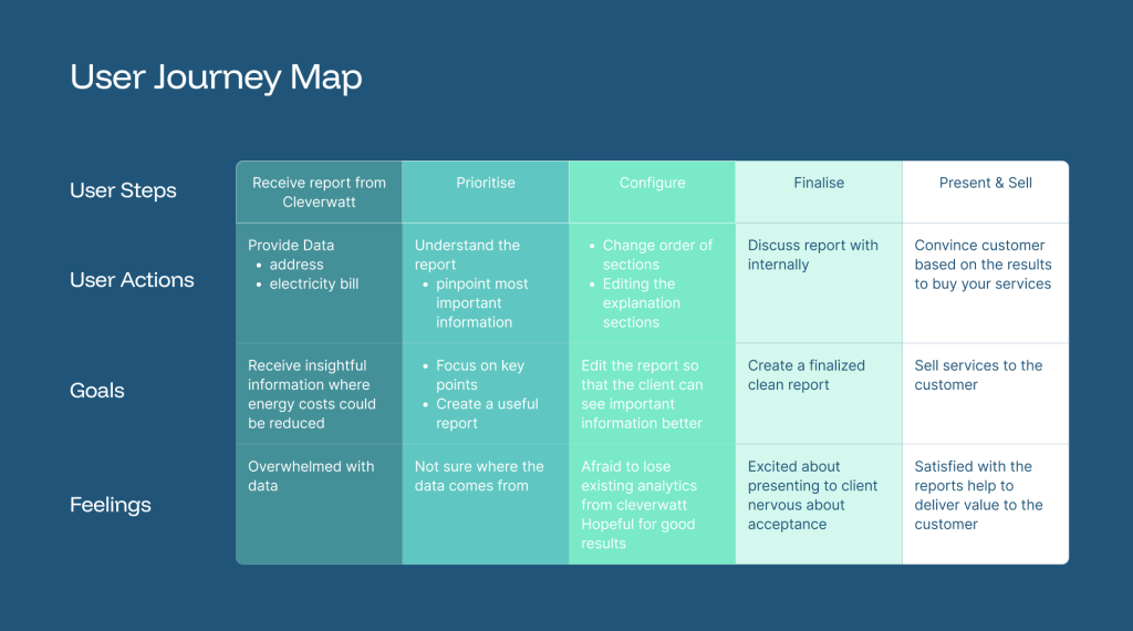 Next, we created wireframes and validated it with the cleverwatt team. After creating a style guide & design system for the UI, we created our first mockups. Recently, we conducted usability study with a user. In a next step, we will implement the feedback.
